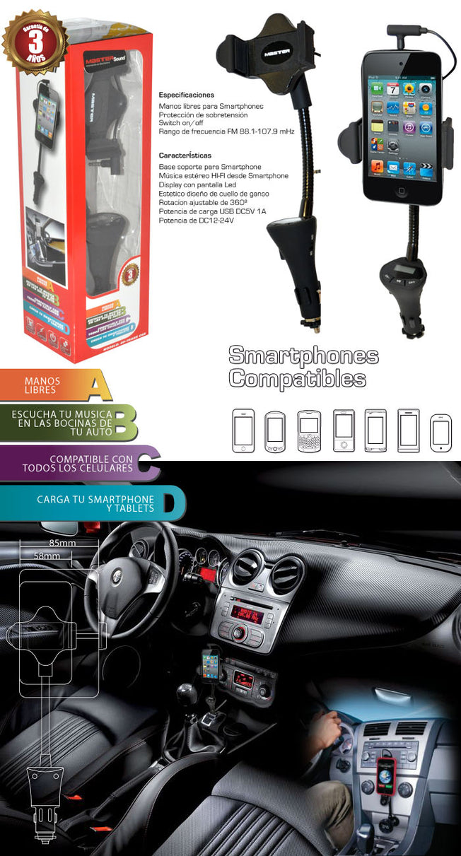 Proveedor:Master ElectronicosTransmisor FM Bluetooth para Auto con Reproductor de Música y Puerto USB | RF-TRANS USBR Conecta a cualquier USB o SD y escúchalo en tu auto estéreo. Conexión directa con la toma del encendedor. Incluye control remoto. Cuenta con pantalla LCD. 206 canales de frecuencia...