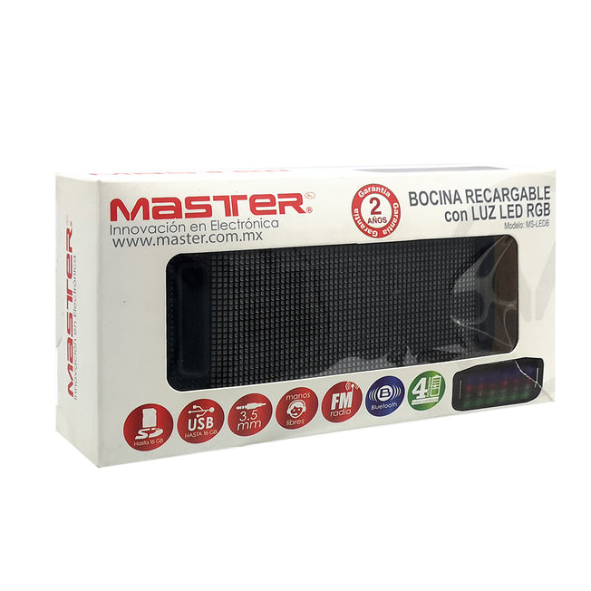 Proveedor:MASTERBocina portátil recargable | MS-LEDB El modelo MS-LEDB es una minibocina con Bluetooth con un práctico diseño, iluminación LED en tonos multicolor y no requiere baterías. Recargable Conexión Bluetooth de hasta 10 metros Radio FM...