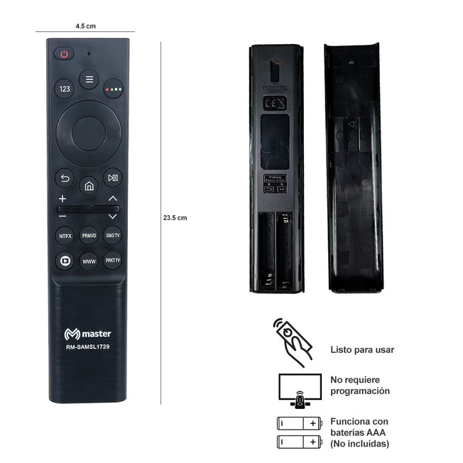 Proveedor:Master ElectronicosControl Remoto Universal Compatible con Samsung Smart TV | RM-SAMSL1729 Control Remoto Universal para Samsung Smart-TV HDTV LED/LCD TV. Compatible con televisores inteligentes Samsung y no requiere programación ni emparejamiento.Fácil de operar y usar.