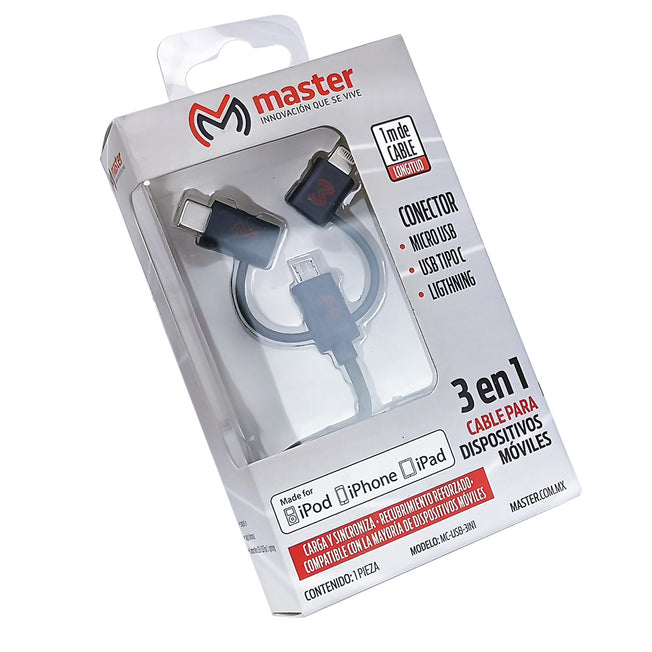 Proveedor:MASTERCable para dispositivos móviles 3 en 1 | MC-USB-3IN1 El modelo MC-USB-3IN1 es un cable para conectar dispositivos móviles, que cuenta con 3 terminales de conexión diferentes para poder conectar prácticamente cualquier dispositivo móvil de nueva generación. Este cable...