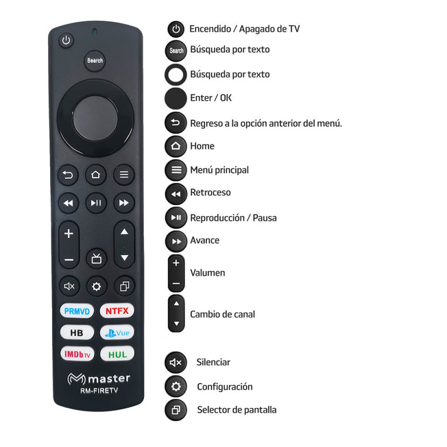 Proveedor:MASTERControl Remoto Compatible con Toshiba & Insignia Fire TV | RM-FIRETV Control Remoto Universal Compatible con televisores Toshiba Fire y televisores Insignia Fire/Smart con Botones de Acceso Directo Prime Video, Netflix, HBO, Vue, ImdbTV y Hulu. Características Destacadas: Compatibilidad Directa: Funciona...
