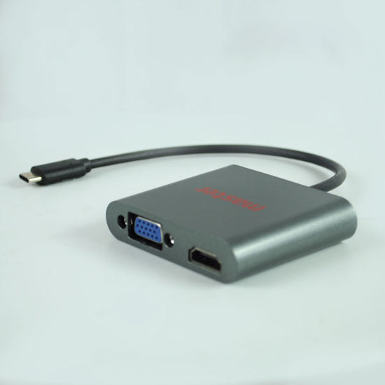 Este convertidor multifunción para equipos con salida de conexión USB “Tipo C”, te permite incrementar disponer de dos salidas de video adicionales en tu equipo de cómputo, aumentando se compatibilidad y permitiendo que puedas conectarlo a otros dispositivos. La primer conexión corresponde a un puerto HDMI, la cual nos permite poder conectar nuestro equipo a una pantalla, proyector o monitor adicional, ya sea para que lo utilicemos en caso de que se haya dañado el que está salida en nuestro equipo de cómputo o también para extender nuestro escritorio en monitor extra, de esta forma podremos disfrutar de nuestros contenidos en alta definición, compartir presentaciones, ver películas o reproducir videos. La segunda conexión hace la misma función, pero ahora a través de un puerto VGA, la cual nos permite poder conectar nuestro equipo a un proyector o monitor que tenga este tipo de conexión, de esta forma podremos proyectar nuestras imágenes de igual forma. Esta salida de video se complementa con una salida de audio que a través de un conector plug 3.5 mm nos permite enviar el audio a un bafle o equipo de audio para escucharlo con mayor volumen, el cual es muy útil cuando estamos proyectando películas. Por último, dispone de un puerto USB “Tipo C” a través del cual suministraremos energía al dispositivo en caso de que sea necesario, para ello podemos utilizar cualquier puerto de carga USB estándar.