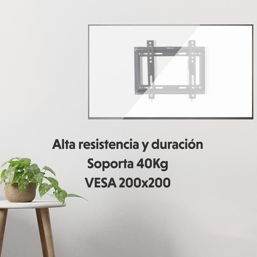 Su plato fijo te proporciona mayor estabilidad y mejor adherencia a la pared, además su fino acabado mate combina con cualquier pantalla y hará juego con la decoración de tu hogar. Es compatible con pantallas de 14 hasta 43 pulgadas, de esta forma si más adelante cambias tu pantalla por una más grande no necesitaras cambiar tu soporte. Soporta un peso de hasta 40 kilogramos por lo que no tendrás que preocuparte de que tan pesada es tu pantalla, colócala de forma cómoda y segura. Su facilidad de uso lo vuelve ideal para pequeños espacios, se adapta a la mayoría de los lugares. Además, incluye un juego completo de tornillos y taquetes para que no pierdas tiempo buscando accesorios adicionales durante la instalación.