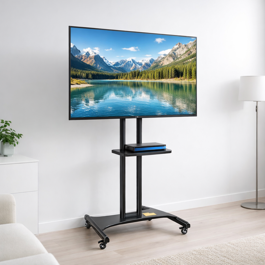 Este soporte de piso te permite poder colocar tu pantalla LCD o LED directamente sobre el, sin necesidad de una estructura de soporte adicional, permitiéndote libertad para mover la pantalla al lugar donde lo requieras, es ideal para exhibiciones temporales para hacer más estética y atractiva tu exhibición o para áreas en donde se requiere mover los equipos continuamente. Cuenta con una repisa de altura fija, que te permite colocar aparatos o dispositivos adicionales, como pueden ser equipos Blu-ray, DVD, o consolas de videojuegos, etc. para poder utilizarlos o exhibirlos junto con tu pantalla.